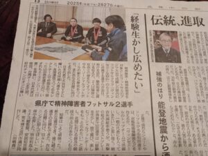 【ルミナス】アジアカップ結果報告・表敬訪問 投稿者:_ 投稿公開日:2025年2月28日 投稿カテゴリー:新聞掲載情報 ヴィンセドールルミナスの山田選手、石田選手が 第1回精神障害者フットボールアジア大会の結果報告・表敬訪問を行いました。 日本代表として大会MVPに輝いた石田選手、アジア連合チームに参加し活躍した山田選手より 馳知事にアジア大会での活動を報告し、激励のお言葉をいただきました。 北國新聞、北陸中日新聞、読売新聞に掲載していただきました。 おすすめ 【GENESIS】金沢星稜大✕障害児トランポリンスクール開催 2024年3月30日 【ルミナス】リハビリテーションアカデミーと連携 2022年9月30日 【ルミナス】全国大会に向けて 2024年4月11日