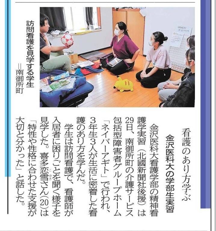 実習生の皆さんには、一日を通して、知的障がいや精神障がいを持つ利用者さんとの関わりや、支援者の方々のお話から、看護師として患者さんとどう向き合っていくかを考えるきっかけになれば嬉しいです。