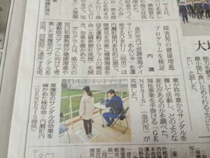 【GENESIS】運動プログラム検証会 投稿者:_ 投稿公開日:2022年10月30日 投稿カテゴリー:新聞掲載情報 金沢市で放課後等デイサービスを運営されている「あんじゅ」様と共催で、 障害のあるお子さんを対象とした運動プログラムの健康増進効果について検証会を開催いたしました。 特殊なサンダルを履くことで得られる健康効果について検証しました。 おすすめ 【ルミナス】アジアカップ結果報告・表敬訪問 2025年2月28日 【GENESIS】羽咋市と障害児者のスポーツ振興を進める協定を締結 2023年12月30日 【ルミナス】リハビリテーションアカデミーと連携 2022年9月30日