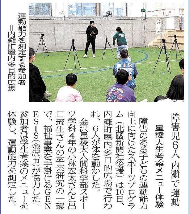 【GENESIS×あんじゅ】星稜大学生による運動プログラムが行われました 投稿者:_ 投稿公開日:2025年11月18日 投稿カテゴリー:新聞掲載情報 11/10(月)に児童発達支援・放課後等デイサービス「あんじゅ」 に通っている子どもたちを対象に、大学の機材を使った反応速度の測定を行いました。 子どもたちは、光ったライトをタッチするスピードを測定するなどして、アジリティの向上の運動プログラムを実施しました。 普段は感情表現があまりない子供にも、時折笑顔が見られ、私たちにとっても貴重な瞬間となりました。 おすすめ 【 明治安田 × ヴィンセドール ルミナス 】明治安田生命様へアジア大会の結果を報告 2025年2月18日 【白山市包括支援センター×GENESIS】むらい予防体操教室に参加しました。 2025年10月1日 【 金沢市 × ヴィンセドール ルミナス 】徳島大会へ向けて金沢市を表敬訪問 2022年11月25日